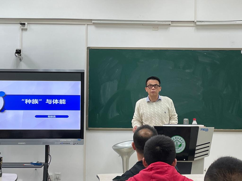 倪依克主任讲座题目为“种族与体能”,从欧美奴隶制度讲起阐释黑人运动员天赋异禀是否与其历史发展和人种迁徙有关,还是黑人运动员本身就具备优于亚洲人的运动天赋?在对非洲历史的剖析和黑人运动员群体分析中得出,黑人运动员运动天赋与亚洲人一样,更多的是历史变迁、国家社会发展、国家经济条件等因素影响。倪教授还以苏炳添今年东京奥运会的突破举例,在人种上的运动差异没有,更多的是环境因素、训练方法和社会经济条件等影响体能和运动能力。