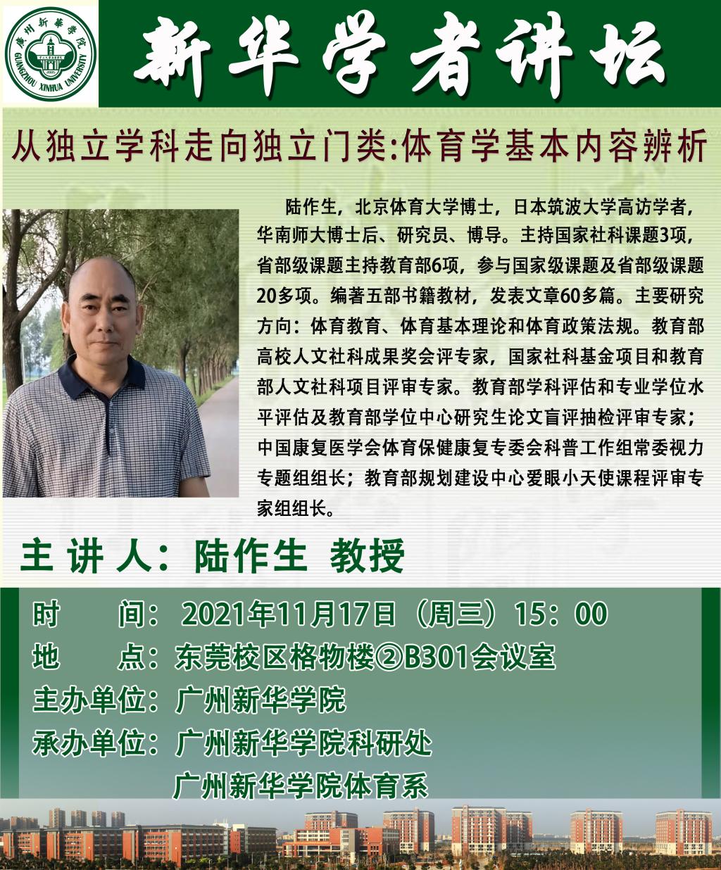 体育系于2021年11月17日下午15:00在东莞校区格物楼2B301会议室开展讲座,讲座由华南师范大学陆作生教授主讲,主讲题目为“从独立学科走向独立门类:体育学基本内容辨析”。参加讲座的有体育系主任倪依克教授,体育系副书记、副主任王阳,体育系副主任陈昌,社体专业主任胡美及全体体育系教师,讲座由体育系主任倪依克教授主持。
