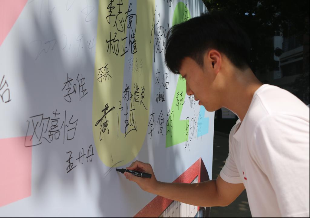 每位同学脸上都充满着对大学的期待,期待着自己即将到来的大学生活。他们各自在签名墙上写下自己的名字,在即将开启的校园生活中留下一个美好的开端。