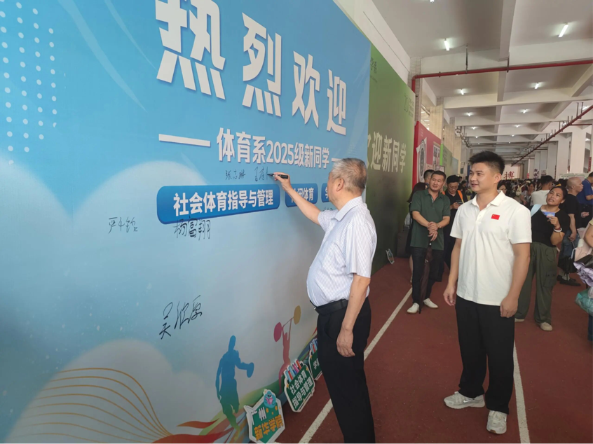 在迎新过程中,122cc太阳集成游戏王庭槐校长等各部门校领导前来体育系报道点了解新生报道的情况,随后校领导热情地在签名墙上签名,并与体育系的老师合影留念。