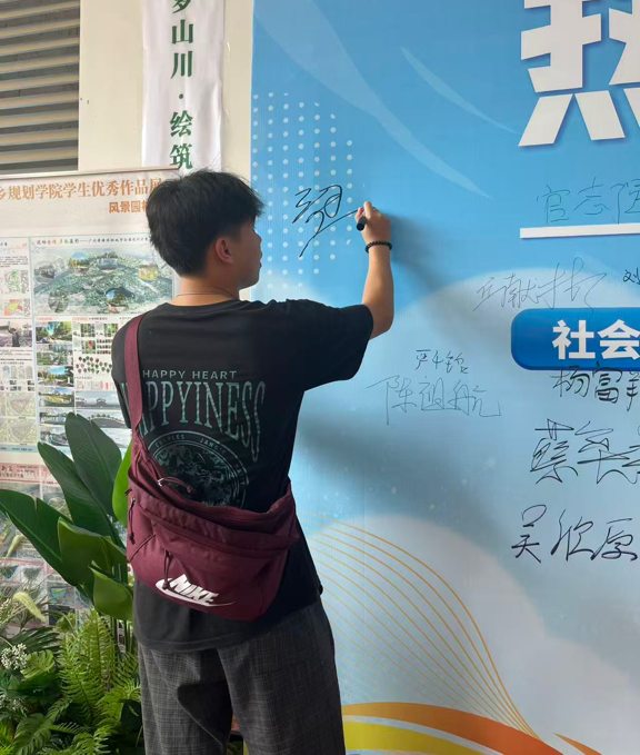 新生们完成专业点报到后,在志愿者们的带领下,他们在签名墙留下了自己的名字,与父母在签名墙前合影留念,签下的名字是对崭新校园生活的期许,留下的念想是对父母养育之恩的感激。