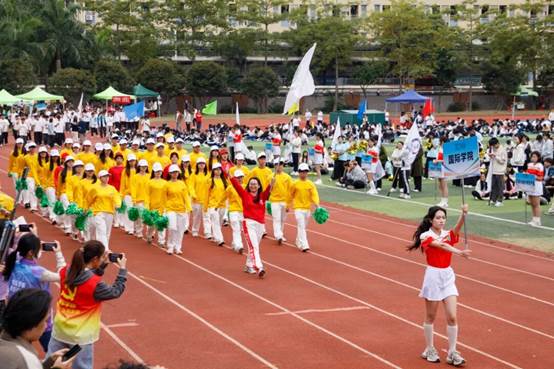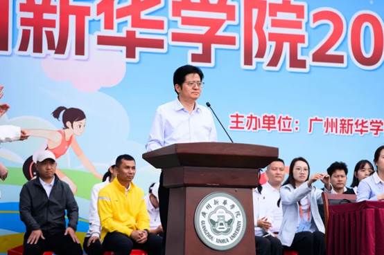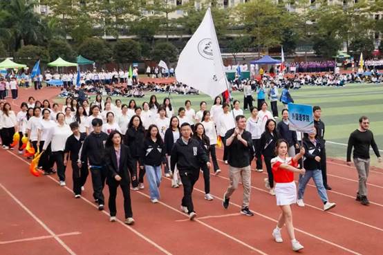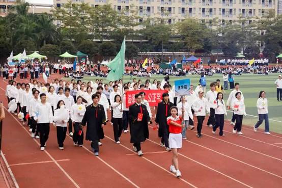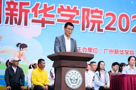 学校校长王庭槐在致辞中回顾了学校二十年发展历程与体育精神的内在契合。他指出,学校全面贯彻党的教育方针,持续完善体育设施、深化教学改革、营造体育文化,切实将“健康第一”理念融入育人全过程。此刻赛场上的青春热情,正与第十五届全运会“激情全运会,活力大湾区”的时代强音交相辉映,彰显了团结协作、勇于拼搏的体育精神。他期望运动员发扬风格、赛出水平;裁判员和工作人员公正履职、保障赛事;广大师生将赛场精神融入日常,以运动促发展。最后,他勉励大家以二十周年为新起点,将体育激情转化为推动学校高质量发展的持久动力。