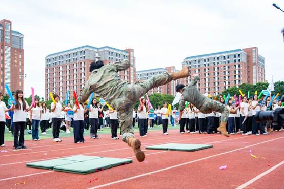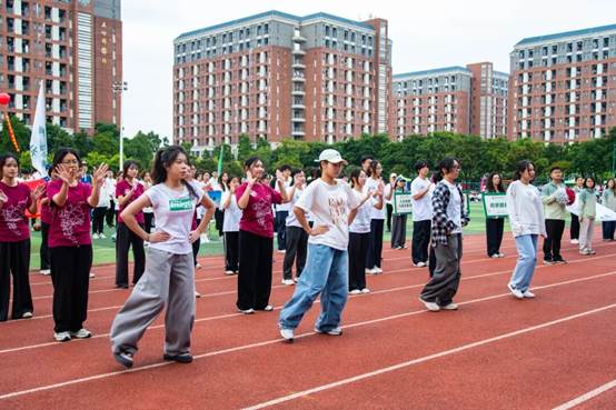 田径场上,各方阵带来了精彩的表演。从活力四射的健美操、街舞,到刚柔并济的太极扇、跆拳道,节目形式多样,精彩纷呈。表演者们或身披五十六个民族的传统盛装,或深情高唱《我和我的祖国》,充分展现了新华学子多才多艺、昂扬自信的青春风采。