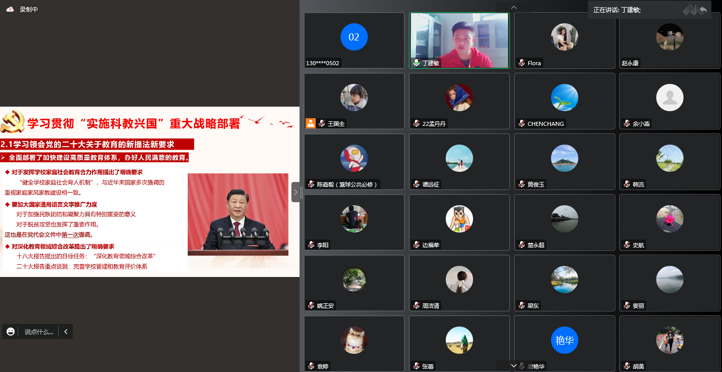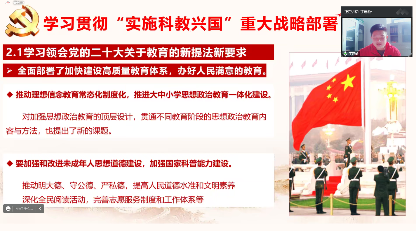 丁建敏讲到二十大报告中关于体育、教育等重要内容的论述,要从基层切实做好思想引导,做好学生工作,做优党建工作,做细支部学习计划等工作,丁建敏副书记阐述了党的二十大报告中一些新提法新要求,要从整体的教育思路贯彻执行,要深入学习贯彻实施科教兴国战略部署,推动理想信念教育常态化,加强和改进学生思想道德建设等。