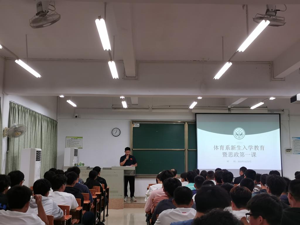 10月8日晚,体育系在定静楼2B201课室召开新生入学教育暨思政第一课,思政第一课由体育系书记、主任倪依克教授主讲,体育系副书记丁建敏主持,参加思政第一课的有体育系副主任陈昌,体育系副主任于克巍,社会体育指导与管理专业主任胡美,休闲体育专业主任张明,体育系办公室副主任王国全,体育系团支部书记龙道金,辅导员,专业班主任及体育系2023级新同学。